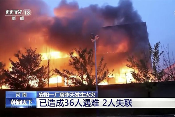 A fire at a factory in Anyang, China, has left 38 people dead and two more in hospital, authorities said on Tuesday.