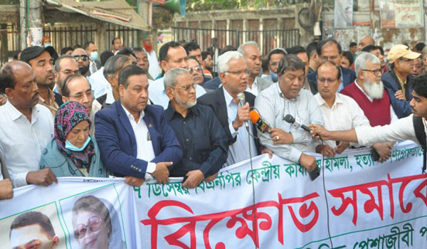 With Engineers Association of Bangladesh (EAB) president Reazul Islam Riju in the chair, the demonstration was addressed by Dhaka Union of Journalists (DUJ) president Kader Gani Chowdhury, Bangladesh Sanmilito Peshajibi Parishad convener Dr AZM Zahid Hossain, BNP Chairperson's adviser Professor Farhad Ali Doner, Professor Dr Tajmeri Islam, DAB leader Rafiqul Islam, Dhaka University pro-BNP teachers' organisation 'White Panel' convener Professor Dr Lutfar Rahman, Teachers Association of Bangladesh president Prof Dr ABM Obaidul Islam, DAB's former president Professor Dr Azizul Huq, Zia Parishad president Abdul Quddus, former editor of the New Nation Mostfa Kamal Mazumder, and BSPP's central leaders were present.